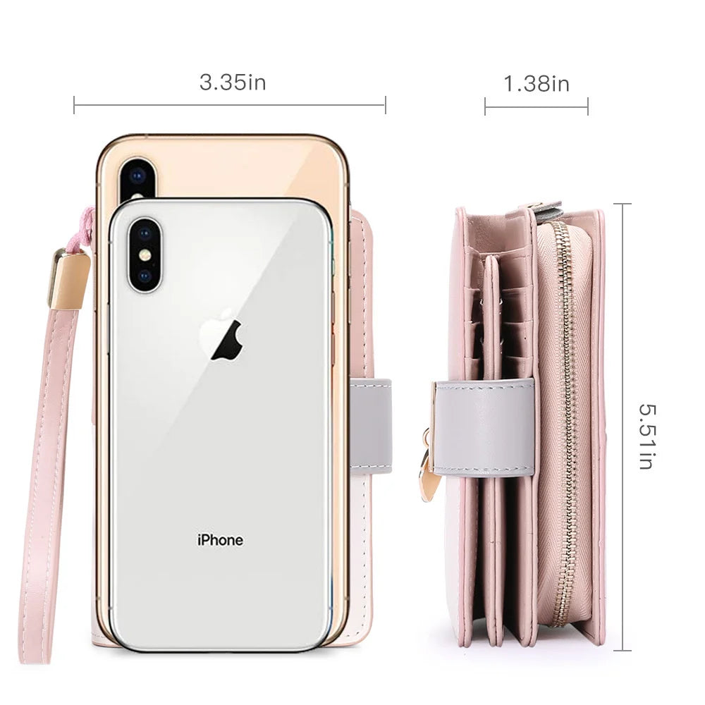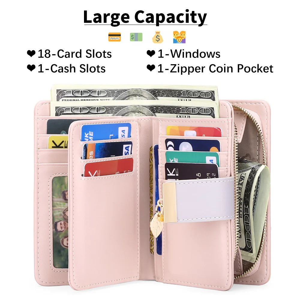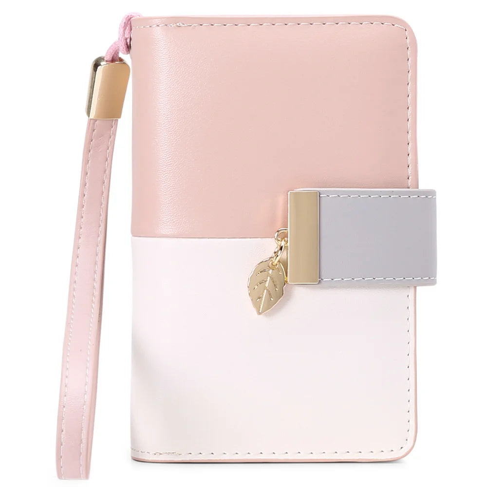 This stylish women's short wallet features a contrast design with a convenient zipper closure and a secure buckle. It has multiple card pockets for easy organization.