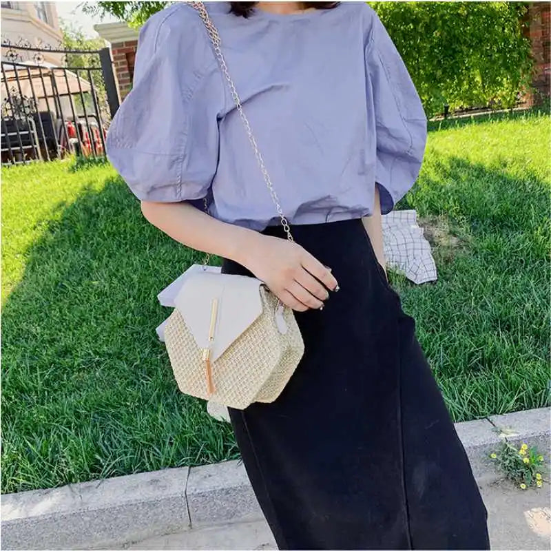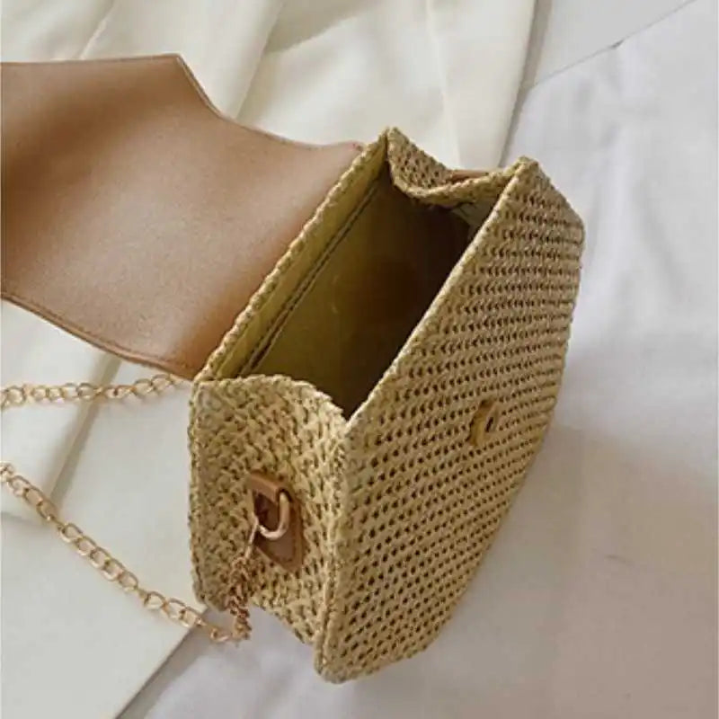Elevate your vacation style with this all-match casual small square bag perfect for the beach. Made from straw with tassel accents, this bag is a must-have for any fashion-forward woman.