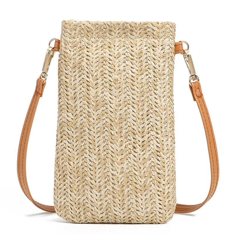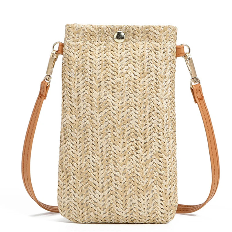 Stay stylish this summer with this woven straw crossbody messenger bag. Perfect for the beach or everyday use. Features a solid design and includes a small mobile phone and coin purse.