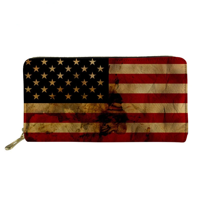 Stay patriotic with this stylish American USA/UK flag print leather wallet. Features a zipper closure, multi-card slots, and ample space for cash and coins.