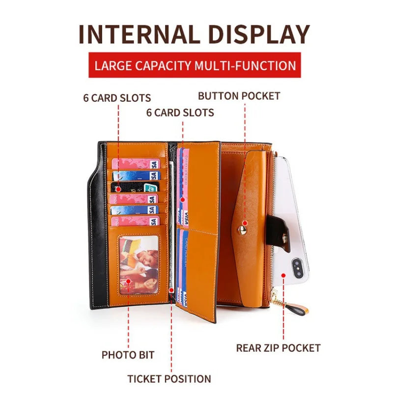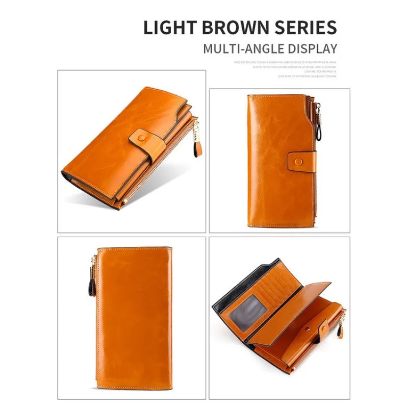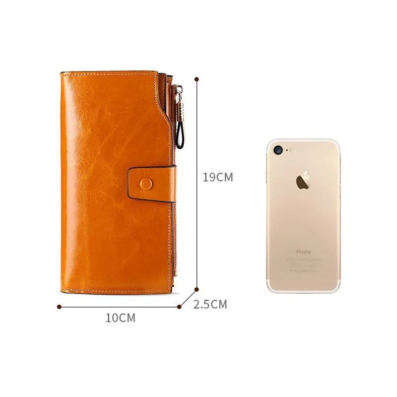 Stay stylish and secure with this top layer leather long ladies wallet designed with RFID anti-theft technology. The oilwax finish adds a touch of elegance to this women's clutch purse.
