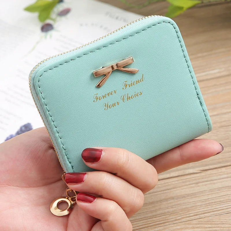 This cute and compact wallet is perfect for holding coins, candy, and other small essentials. It features a stylish bow design and a convenient zipper closure.
