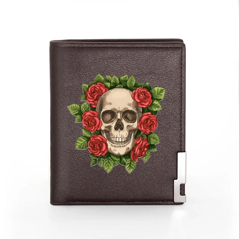 This stylish wallet features a unique charm rose flower skull print design on high-quality leather. It offers convenient storage for credit cards, IDs, and cash in a slim and compact form.