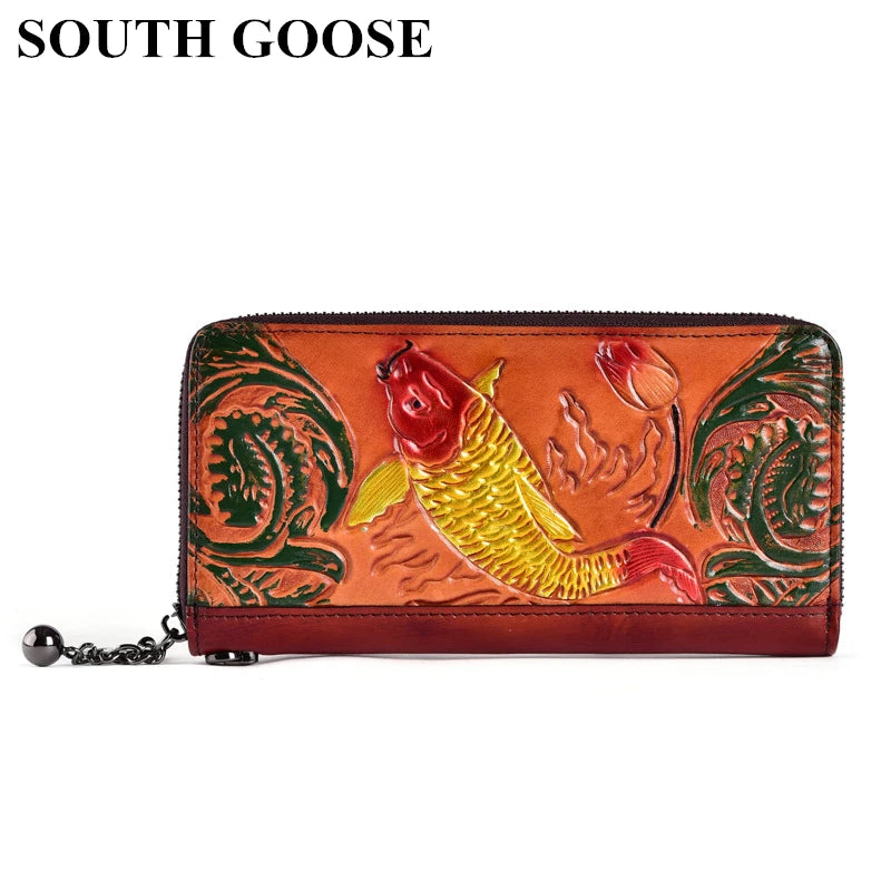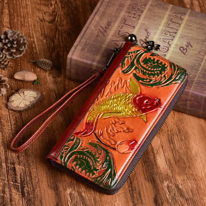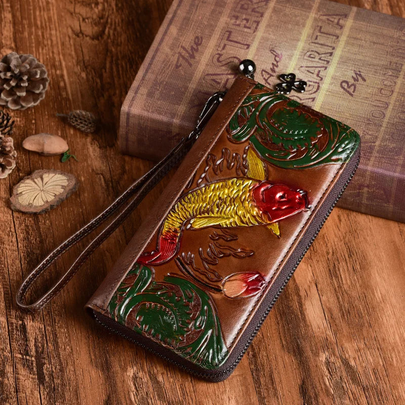 Classic Women Wallets Leather Embossed Golden Fish Zipper Wristlet Bag