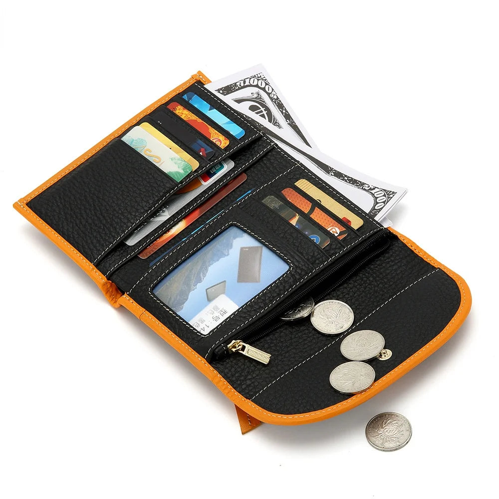 This women's wallet is made of first layer leather and features colorful patches. It has multiple card slots and a fold design.