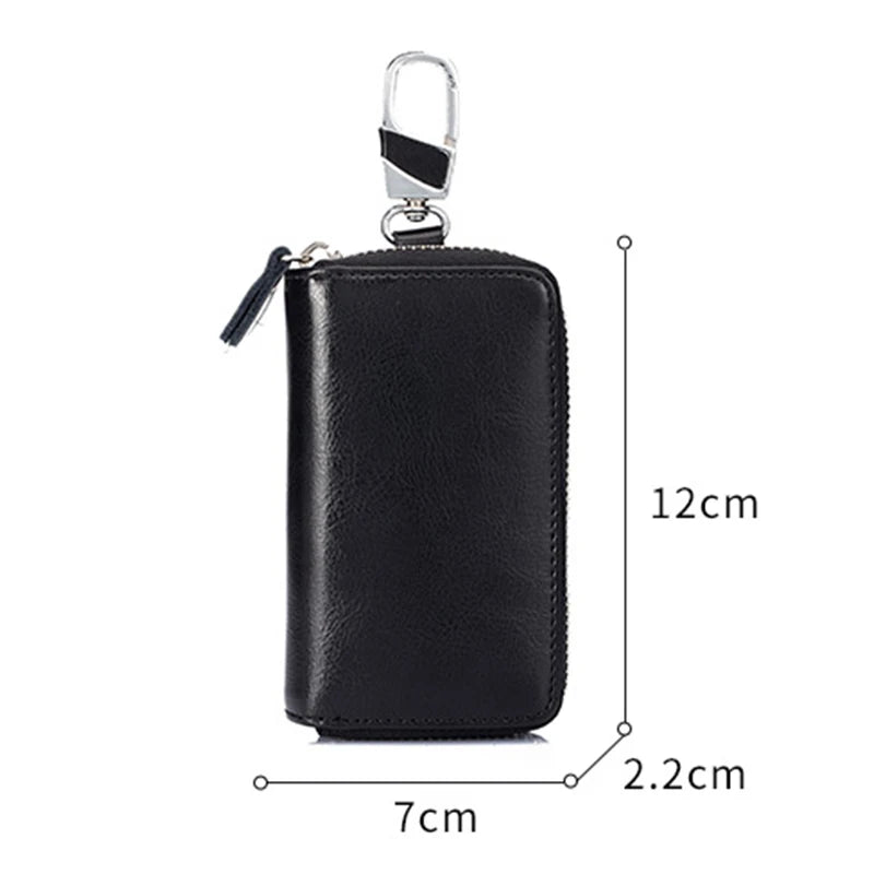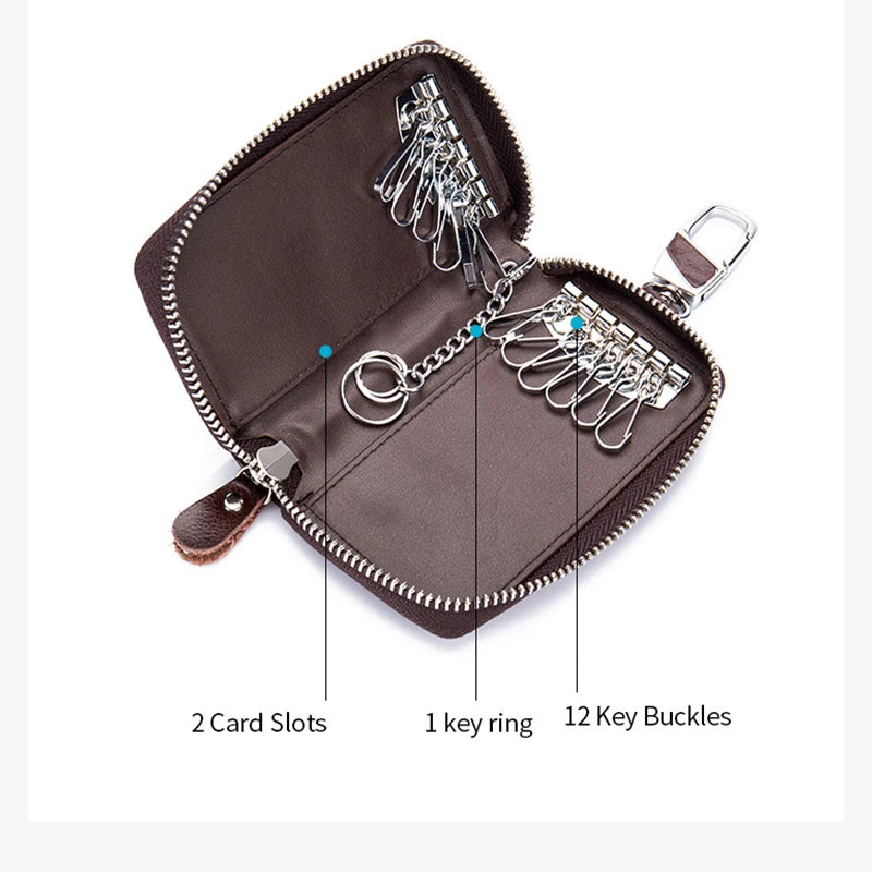 This key chain wallet is made of durable cow leather, perfect for holding keys and organizing them. It features a zipper closure to keep your keys secure.