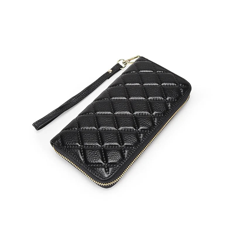 This RFID wallet is made of high-quality cow leather, featuring a zipper closure for security. It has ample space for cards, cash, and coins, making it a practical and stylish accessory for women.