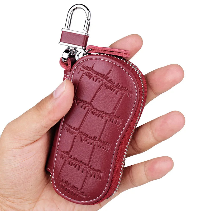 Cowhide Key Holder Case Bag Leather Keychain Cover Zipper Housekeeper