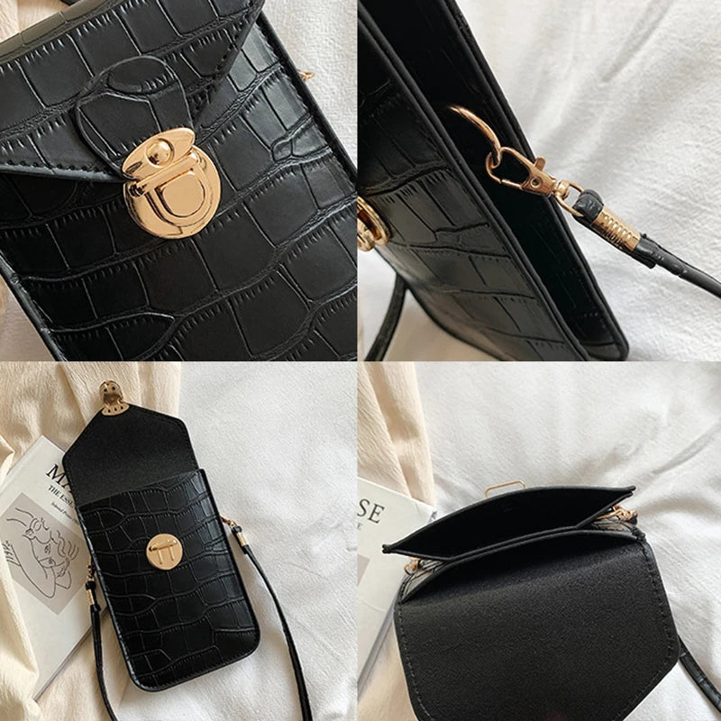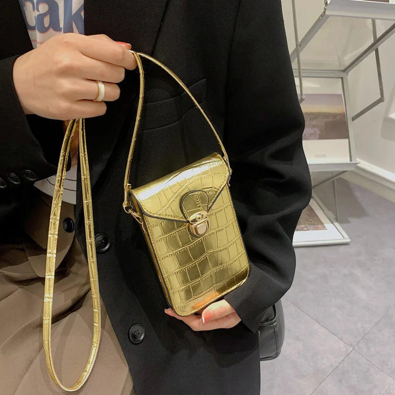 This small silver mobile phone messenger bag is made of crocodile leather, perfect for carrying your phone, wallet, and other essentials. It features a crossbody strap for easy carrying.