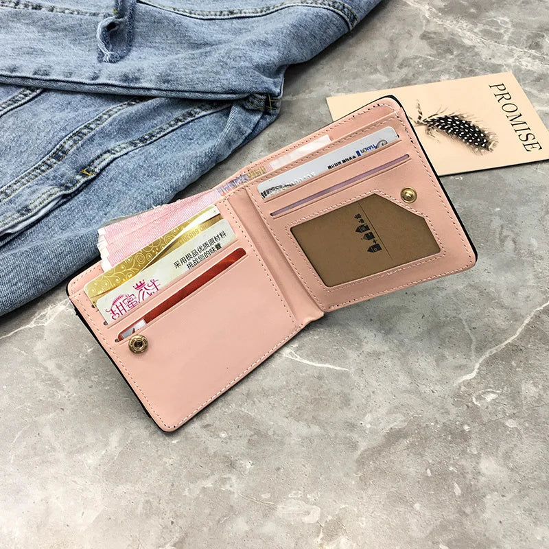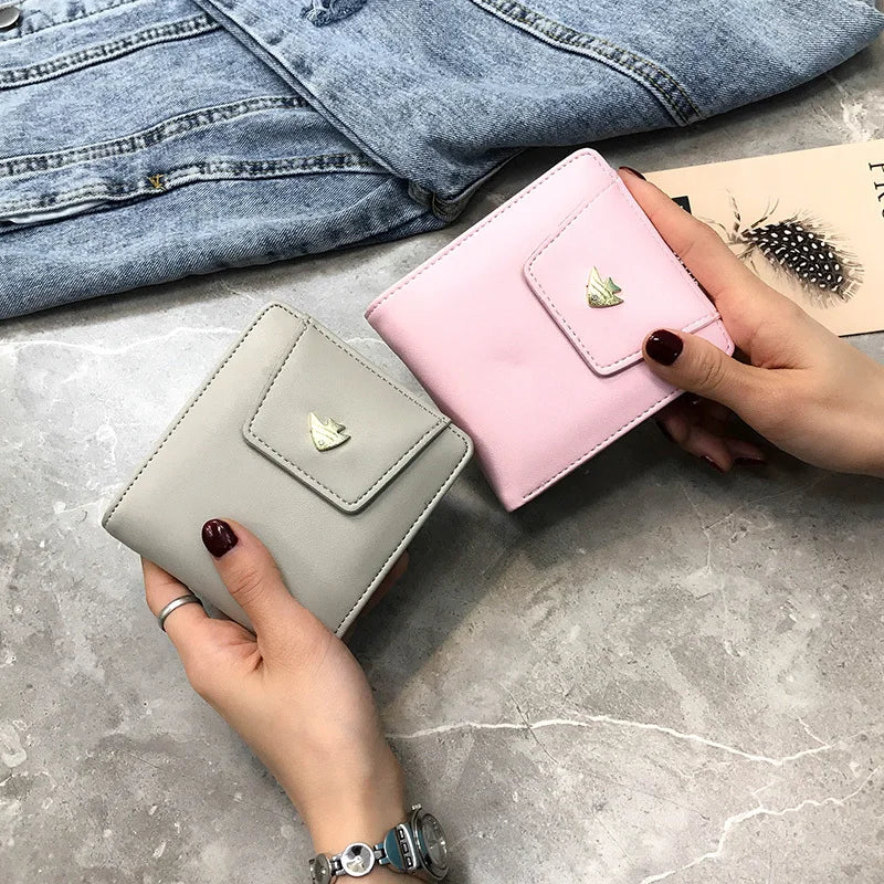 This women's wallet is made of high-quality leather and features a button closure. It is small and compact, perfect for carrying your essentials.