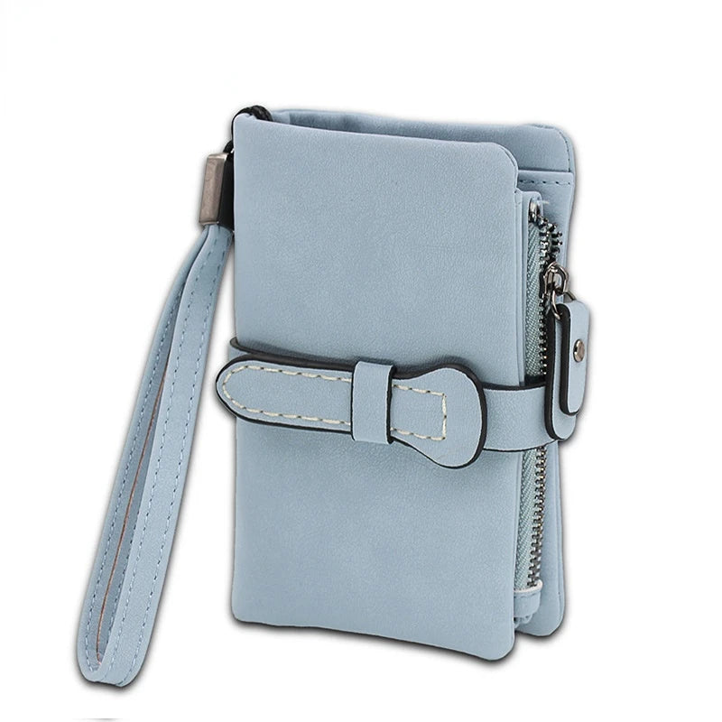 Fold Women Wallets Drawstring Nubuck Leather Zipper Wallet with Wrist Strap
