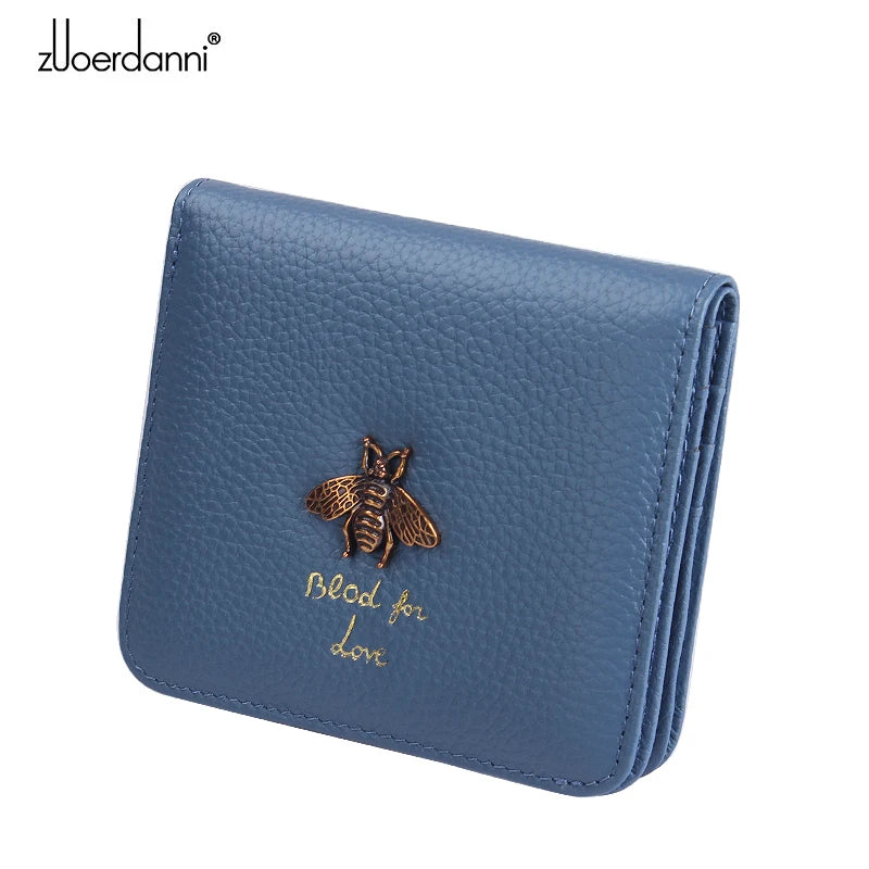 This lady zipper wallet is made of leather and features a thin, short design. It is suitable for women and includes a small bee metal accent on the front. The purse has a retro style with 2 folds.