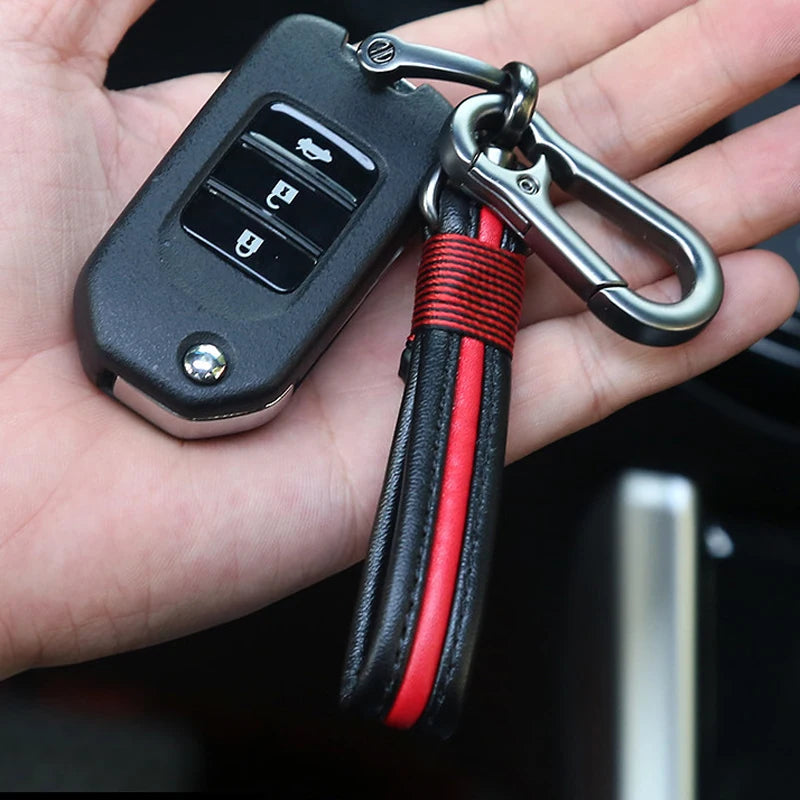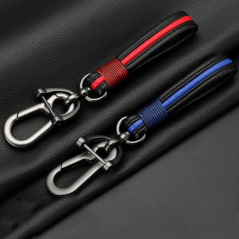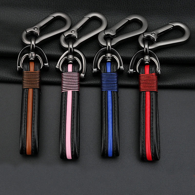 This key chain is made of high-quality leather and metal, designed for both men and women. It is a stylish and portable accessory to hold your keys.