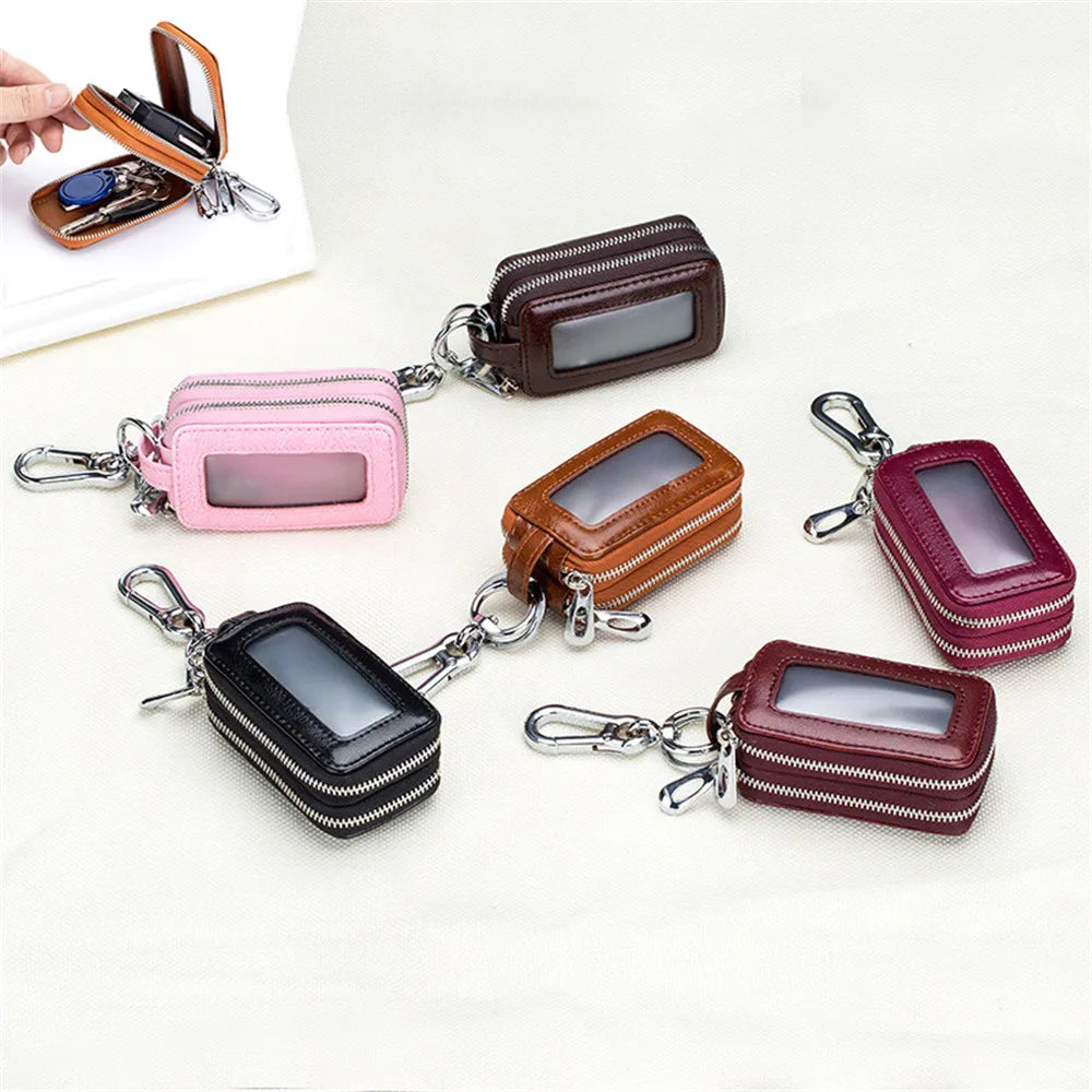 Leather Car Keys Bag Double Pocket Zipper Mini Wallet Key Holder