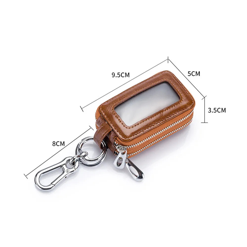 This stylish leather key bag is perfect for both men and women. It features a double pocket design with a zipper closure to keep your keys secure.