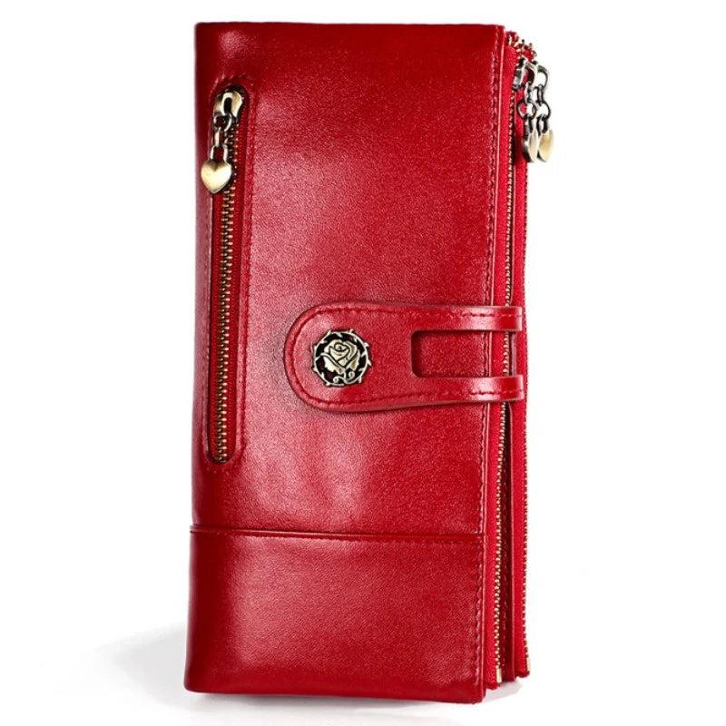 This women's wallet is made of high-quality leather and features a long zipper closure. It has a cellphone holder and multiple compartments for cards and cash.