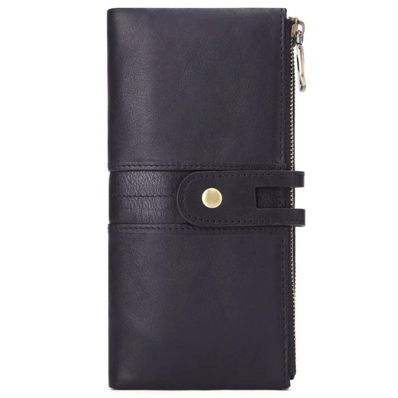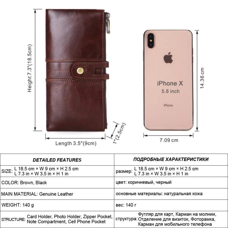 This genuine leather clutch cellphone bag is perfect for both men and women. It features a hasp and zipper closure, ideal for keeping your money and business cards secure.