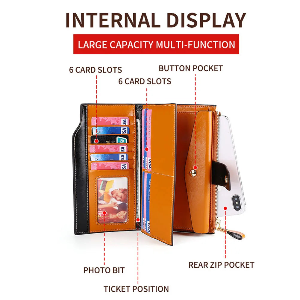 Leather Women's Wallet Long Oil Wax Leather Mobile Phone Clutch Bag