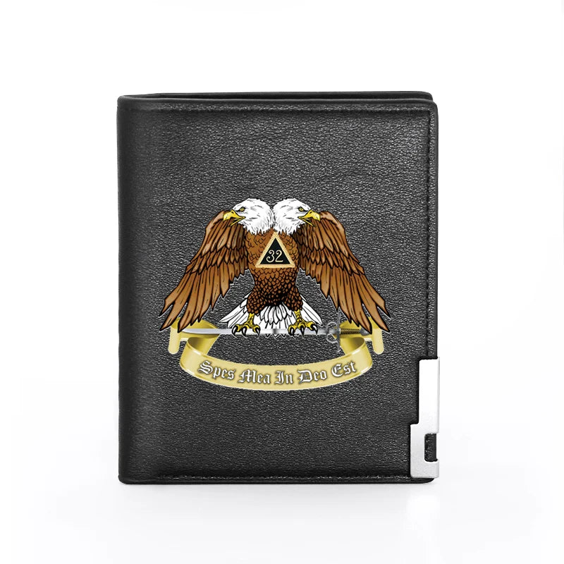 This stylish leather wallet features a high Masonic Eagle 32 print design. It is suitable for both men and women, with multiple card slots and a billfold compartment.