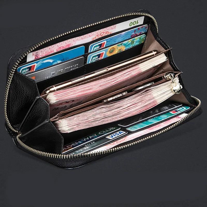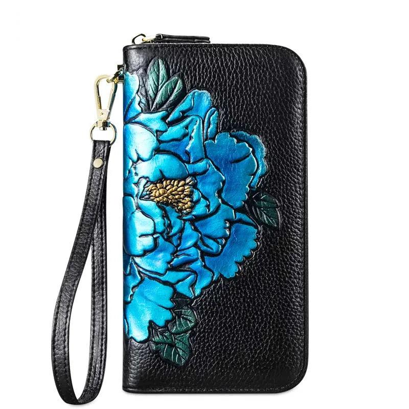 This wallet is made of first layer cow leather with ethnic style peony flower design. It features a zipper closure and offers ample space for cards, cash, and coins.