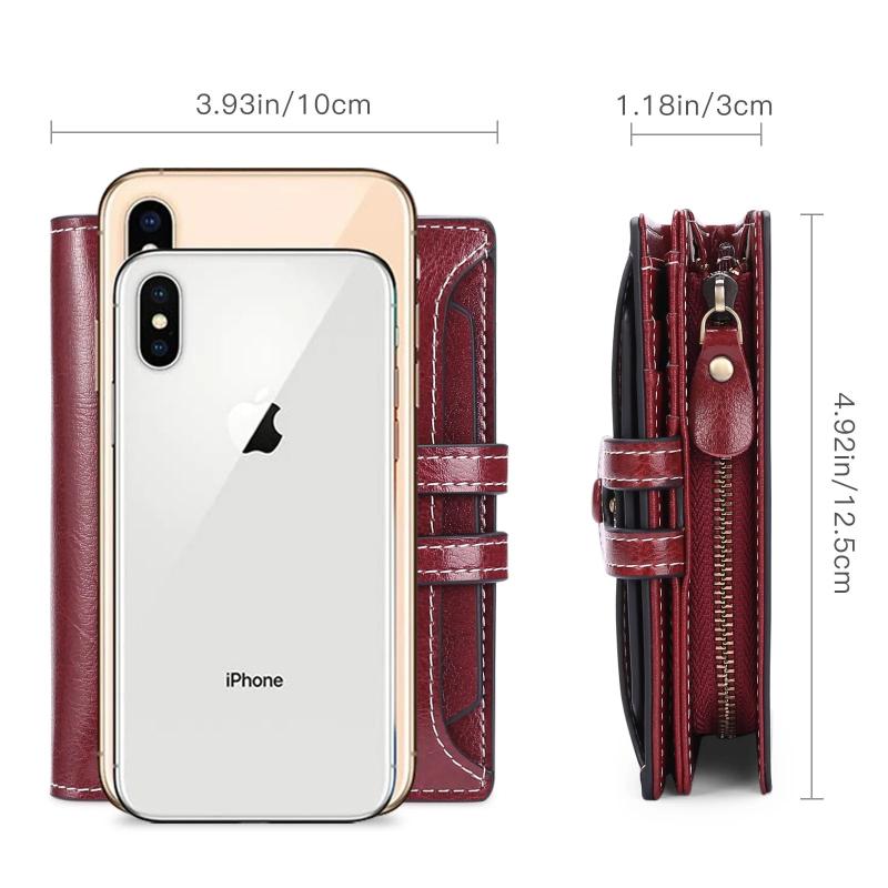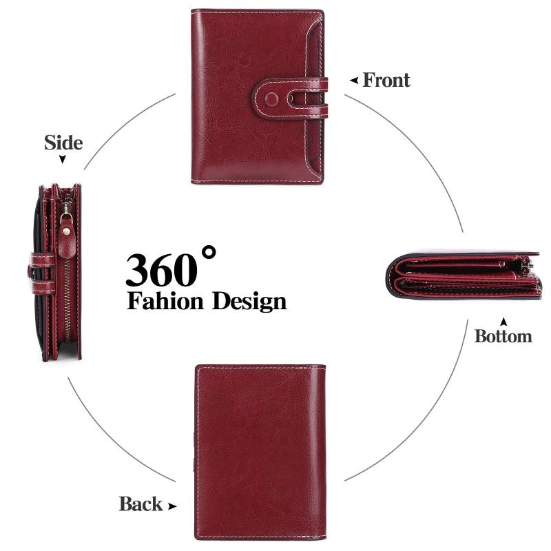 This women's wallet is made of high-quality leather and features a large capacity for cards, cash, and coins. It has a convenient zipper closure.