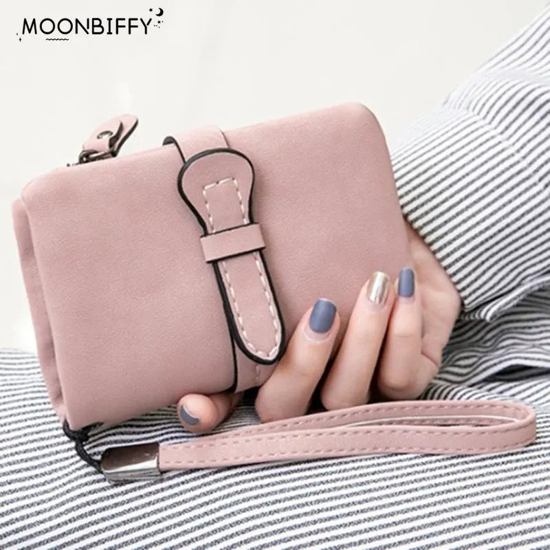 This stylish wallet features a nubuck leather material and a convenient wrist strap for easy carrying.