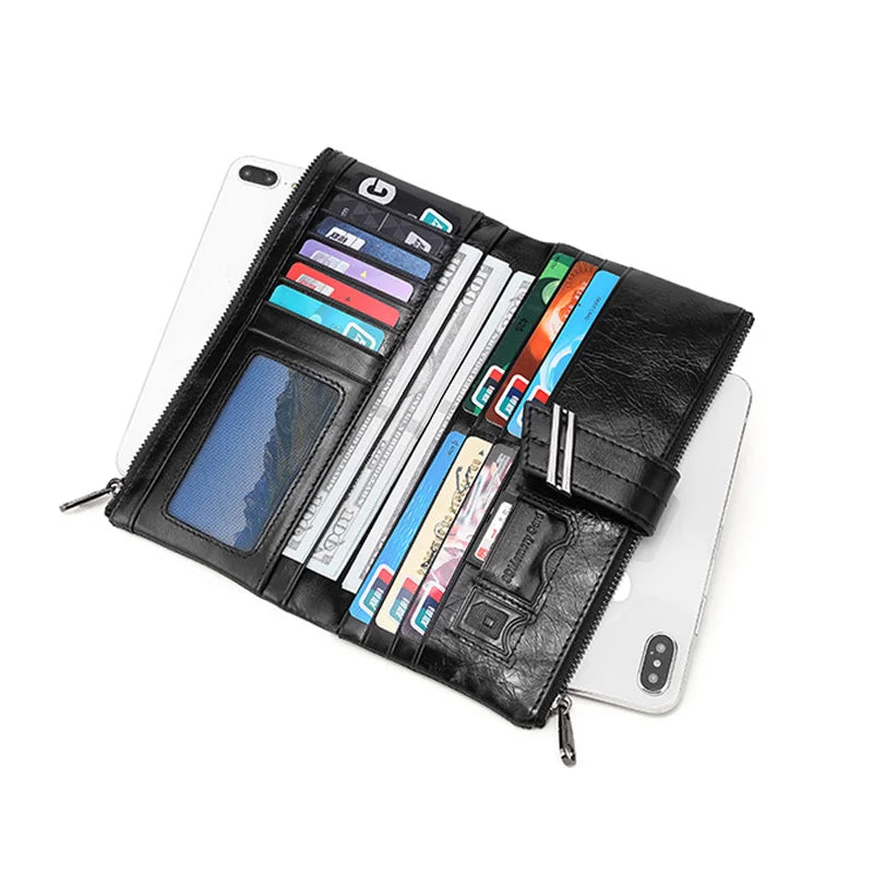 This European and American style wallet is made of high-quality oil wax leather, featuring a double zipper design and spacious compartments for cards and cash.