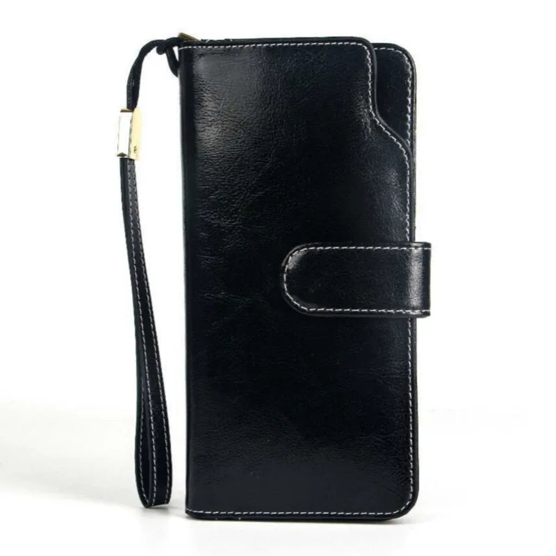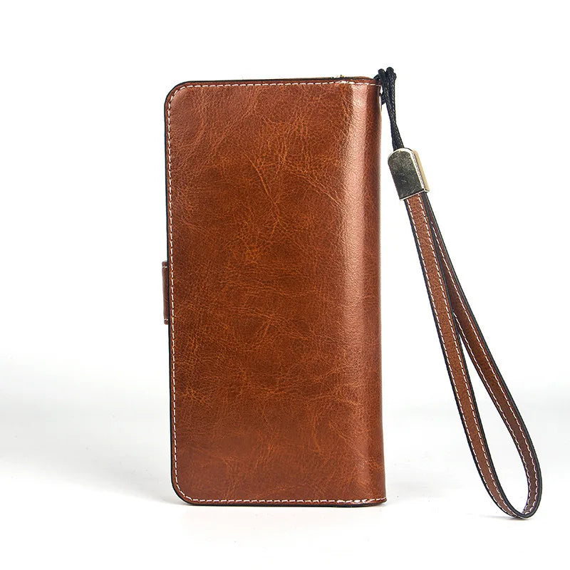 Stay organized with this stylish wrist wallet made of oil wax leather. Features a long design with a coin pocket and phone pouch.
