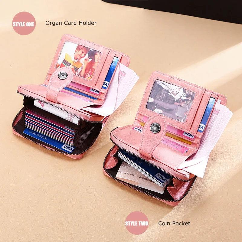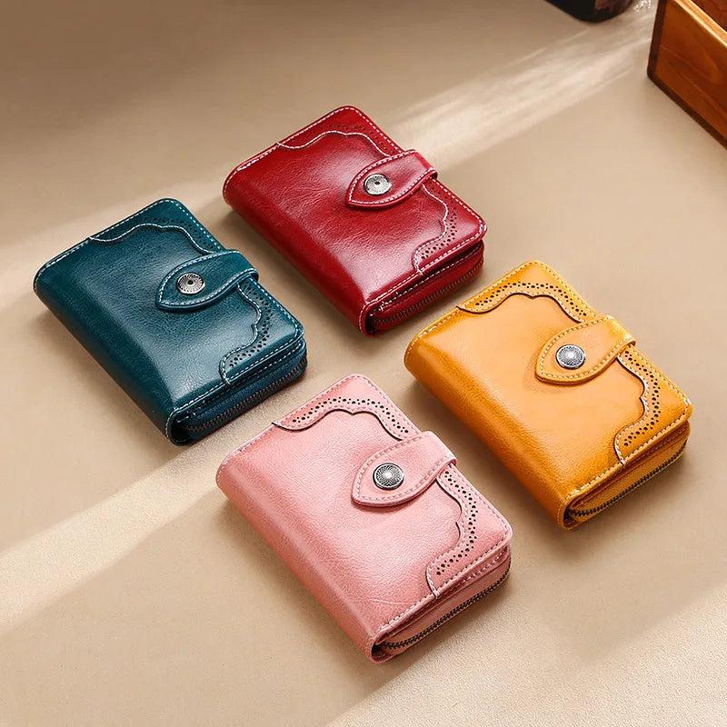 Stay organized and stylish with this oil wax leather ladies wallet. Features card and coin pockets, RFID protection, and a mini clutch design.