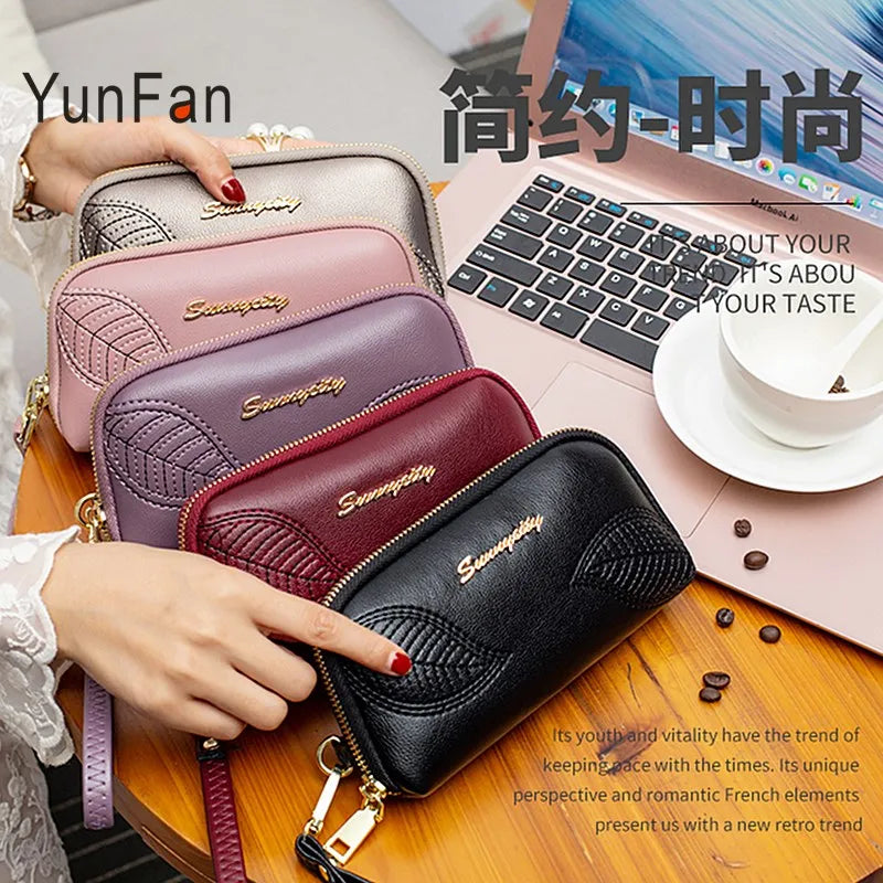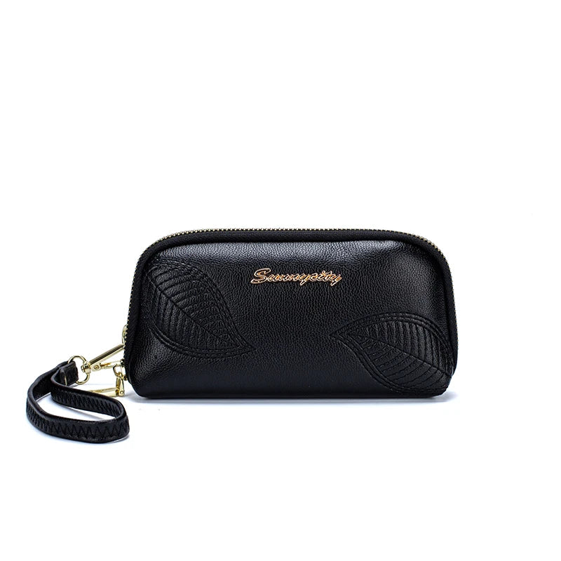 This stylish ladies wallet features a retro design with multiple card pockets, a zipper closure, and a wrist strap. It is made of high-quality leather for durability and style.