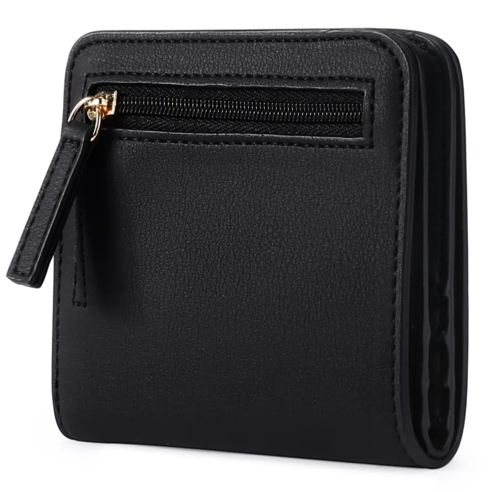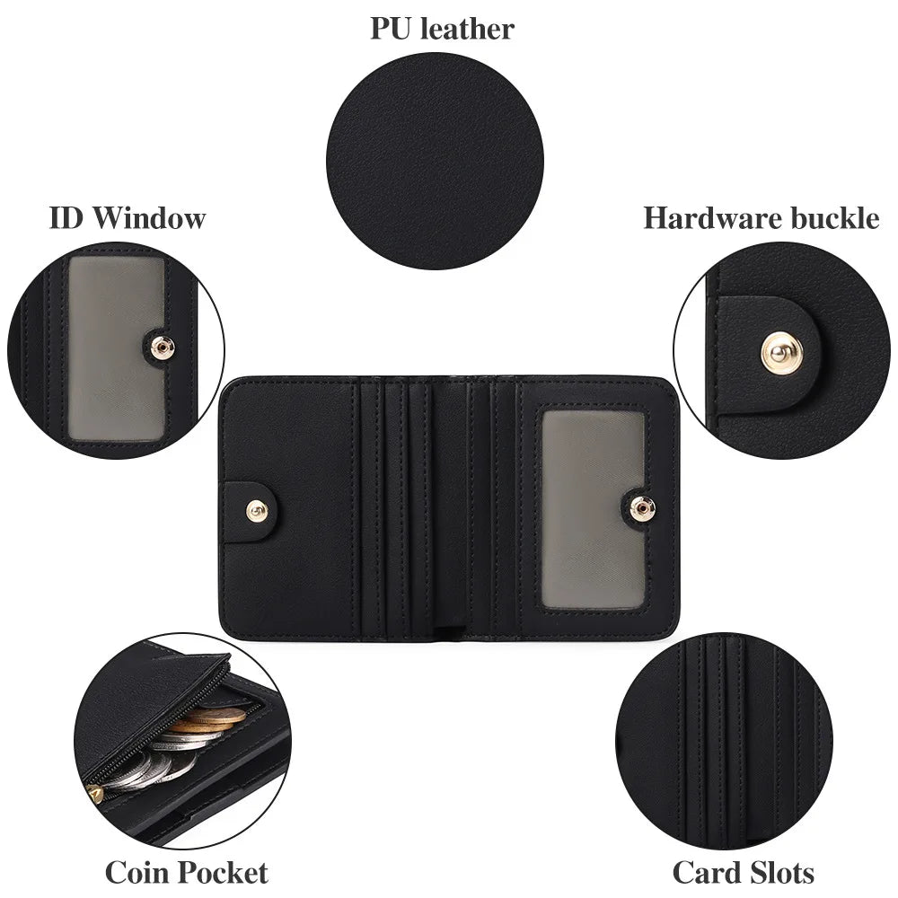 This compact bifold wallet is crafted from high-quality leather with RFID blocking technology to protect your cards. It features a zippered pocket for coins and an ID window for easy access.