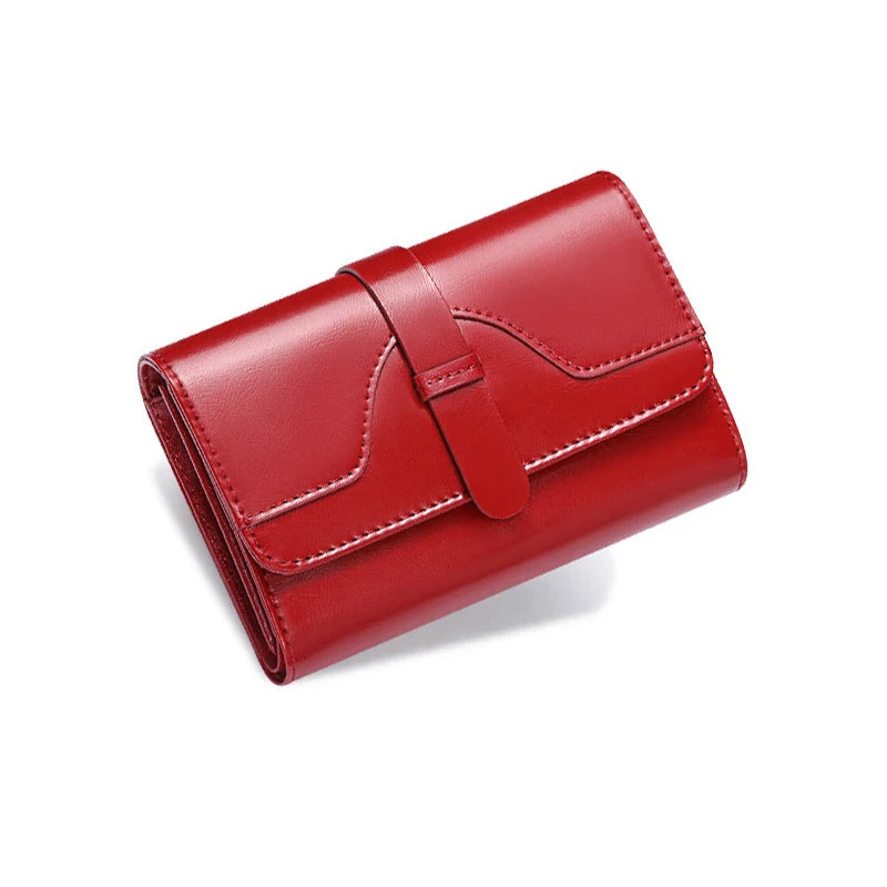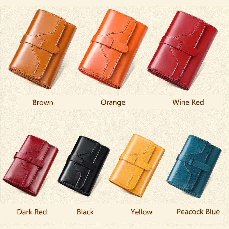 This women's wallet is made of high-quality oil wax leather with RFID blocking technology to protect your cards from skimming. It features multiple card slots, a coin purse, and a compact design.