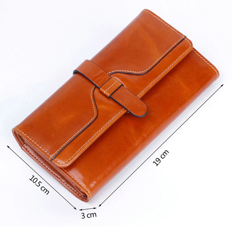 Stay stylish and organized with this RFID women's wallet made of high-quality oil wax cowhide leather. It features a drawstring closure, zipper pocket, and three fold design for more clutch space.