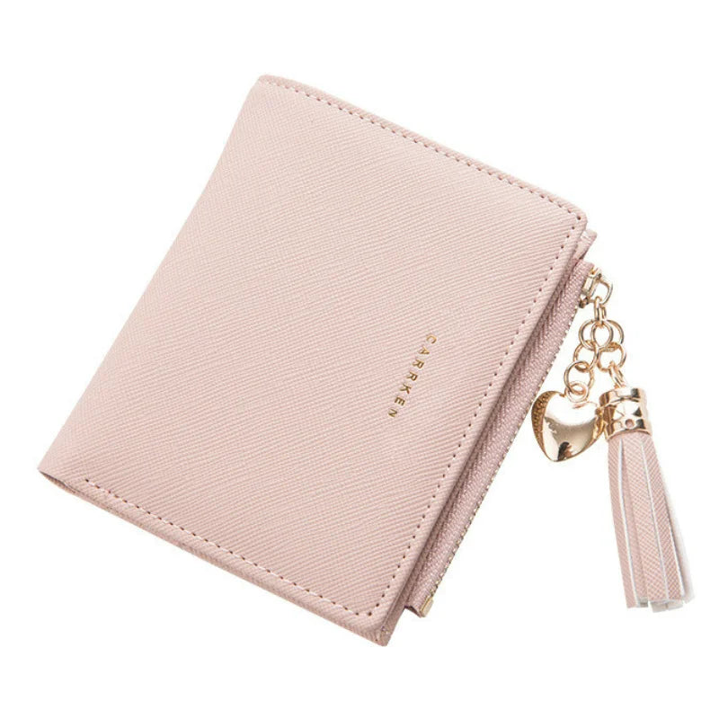 Stay organized and stylish with this small wallet for women. Features a zipper closure and tassel detail.