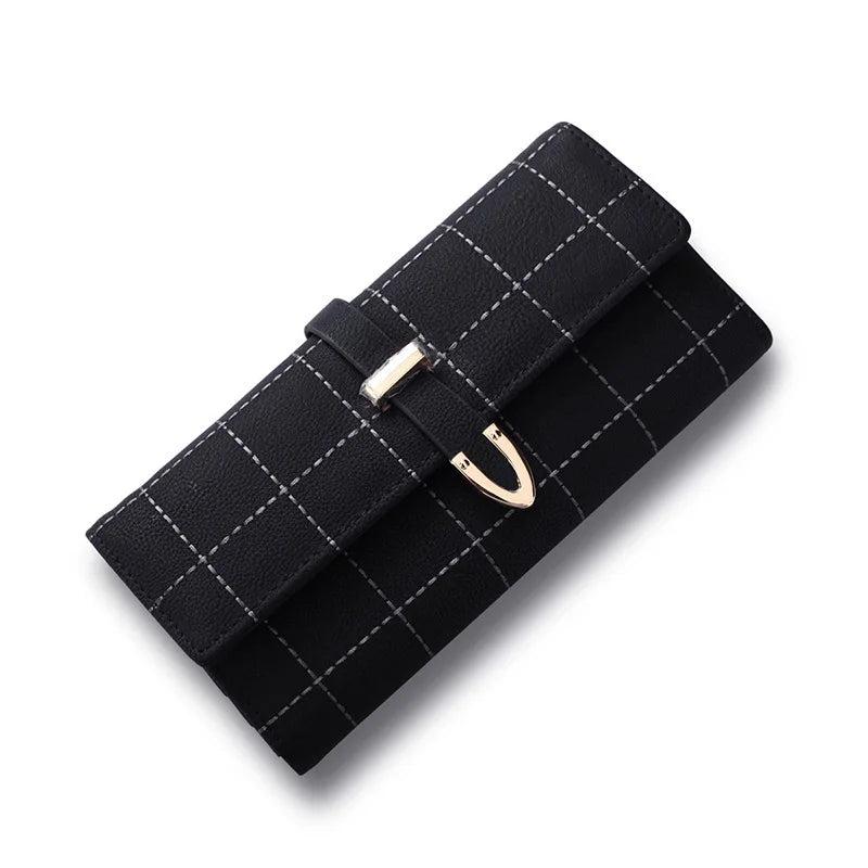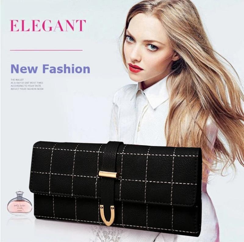 This stylish three fold wallet features a diamond lattice design. It is made of high-quality PU material and has a hasp closure. The wallet has a large capacity and can be used as a clutch bag.