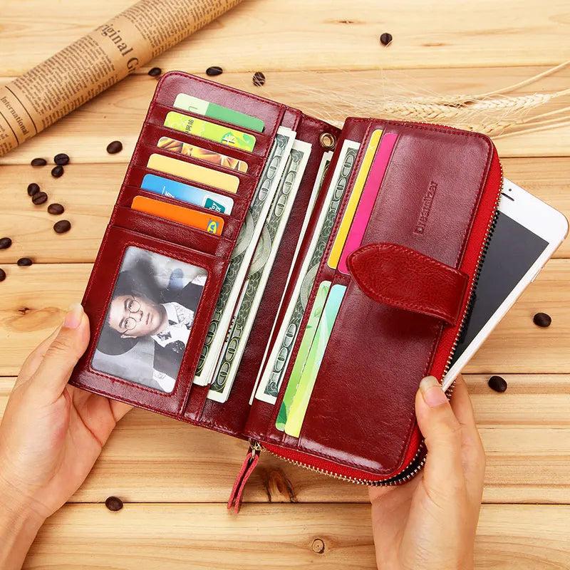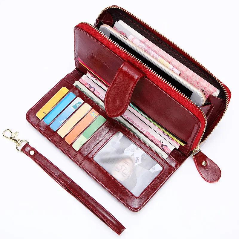 Stay organized with this stylish women's leather wallet made from real oil wax cowhide leather. It features a large capacity to hold all your essentials and is perfect for travel.