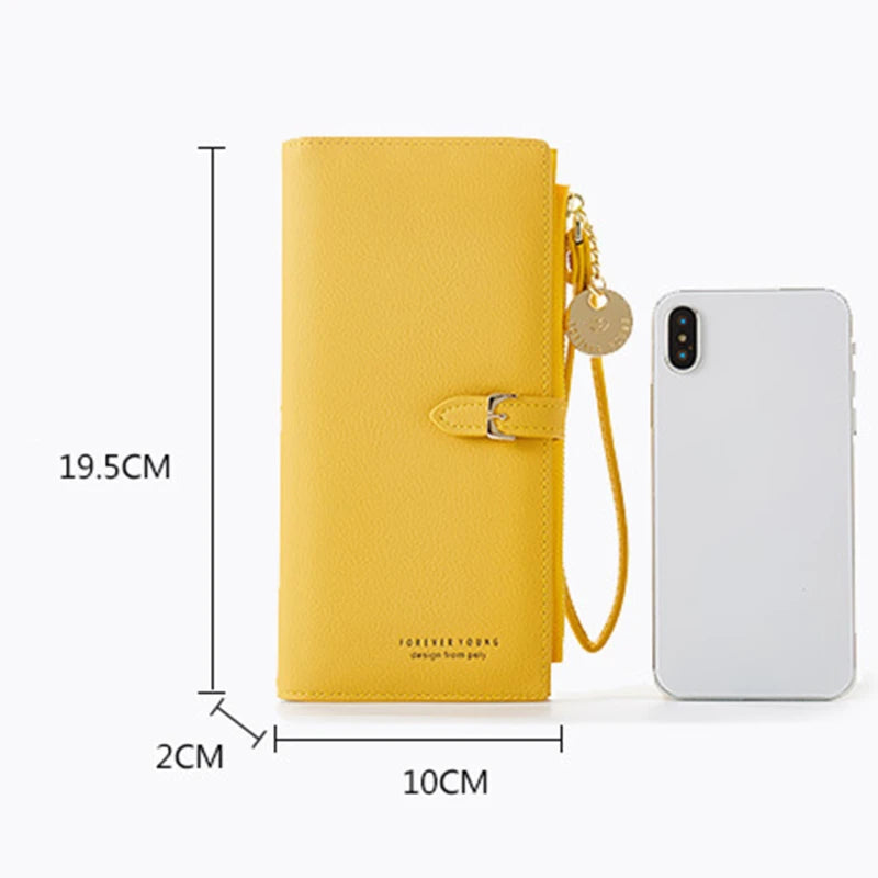 This multifunctional women's wallet is made of high-quality PU leather, featuring multiple card slots, a secure buckle closure, and a convenient zipper compartment. Perfect for students and everyday use.