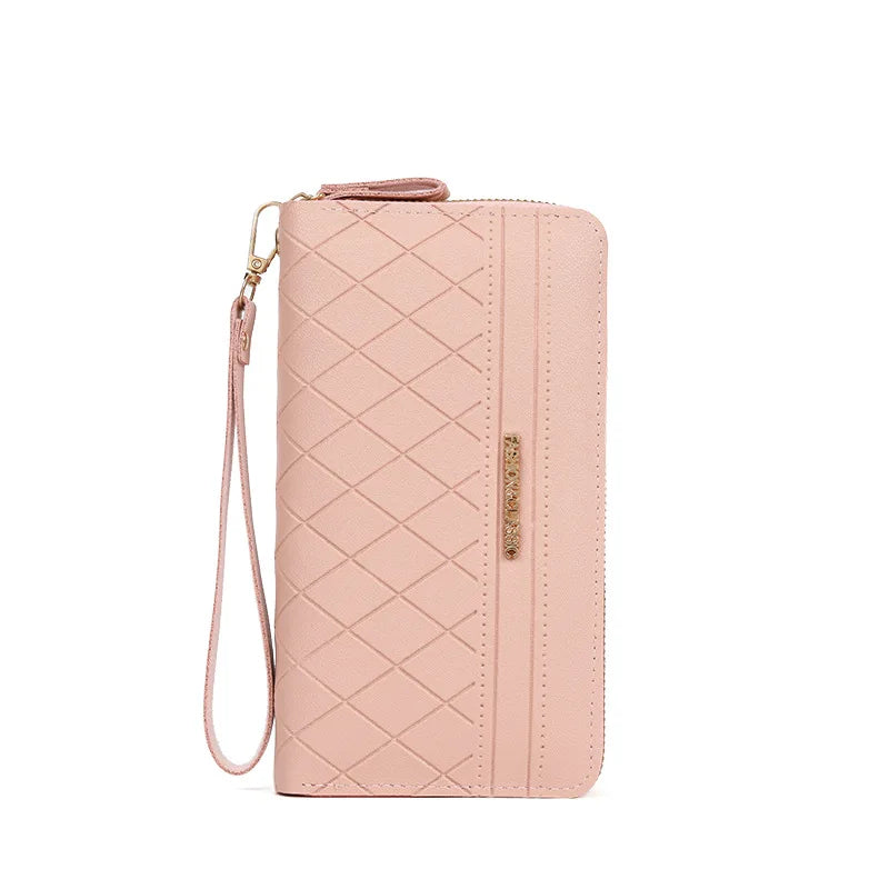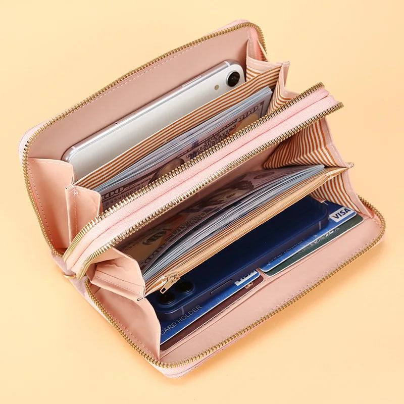 Stay organized and stylish with this pink double zipper wallet made of high-quality PU leather. It features a long design with a high capacity to hold your essentials like phone, cards, and cash.