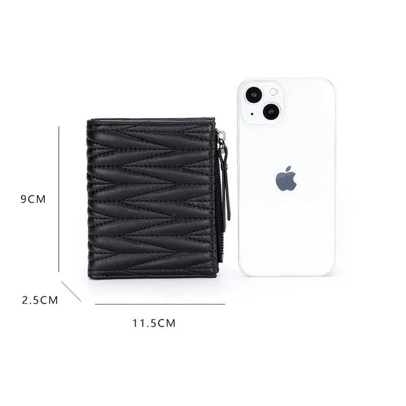 This women's small wallet is made of high-quality sheepskin leather with a short design. It offers a compact size with high capacity to hold money and cards.
