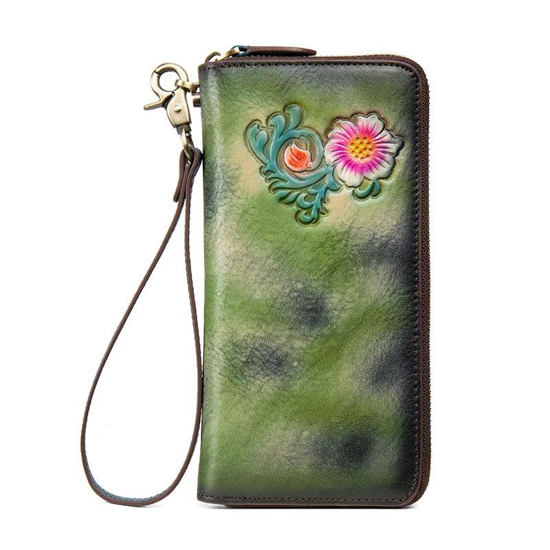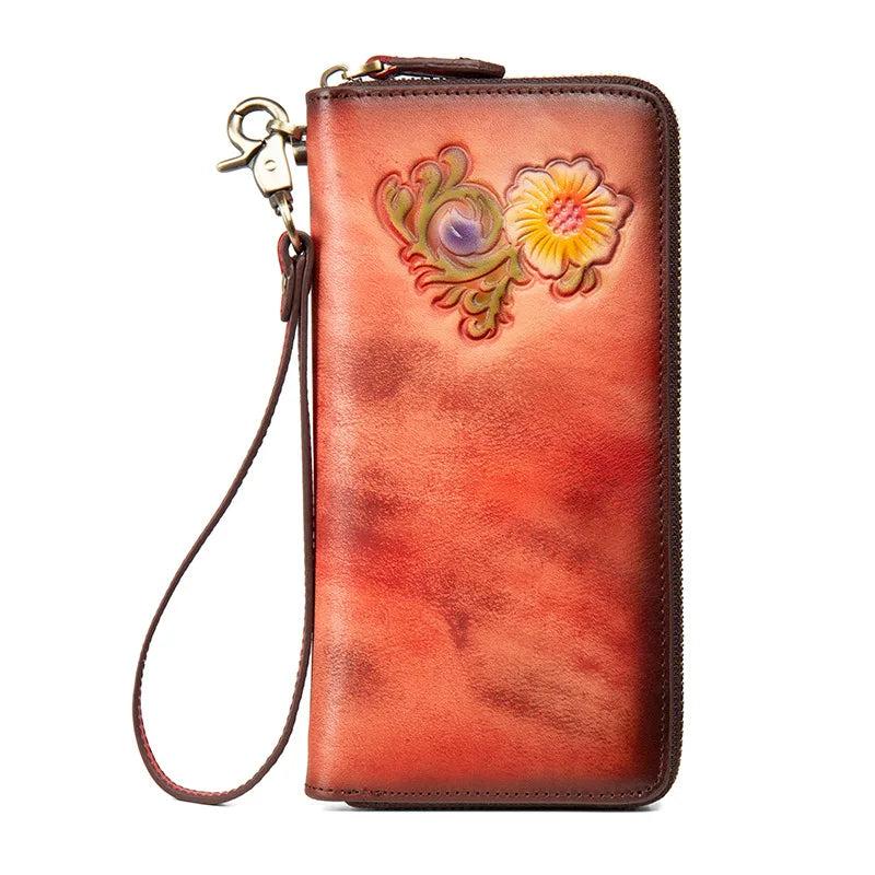 This women's wallet is made of high-quality leather and features a beautiful flower design. It has multiple compartments for organizing your money, cards, and phone.
