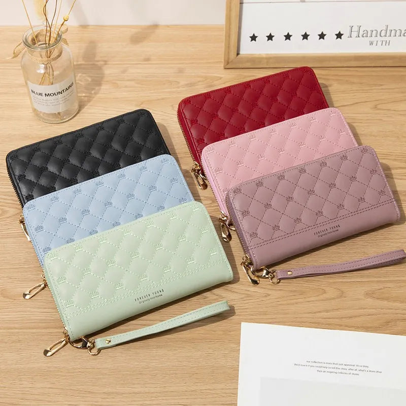 This women's wallet features an embroidered crown design with double zippers, perfect for storing cash, cards, and a mobile phone. It offers multi-card slots and is a versatile accessory for everyday use.