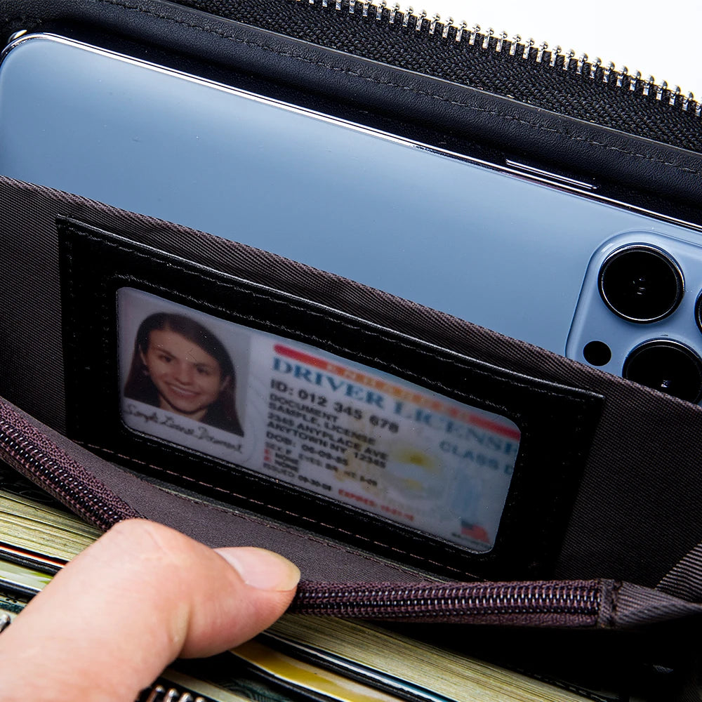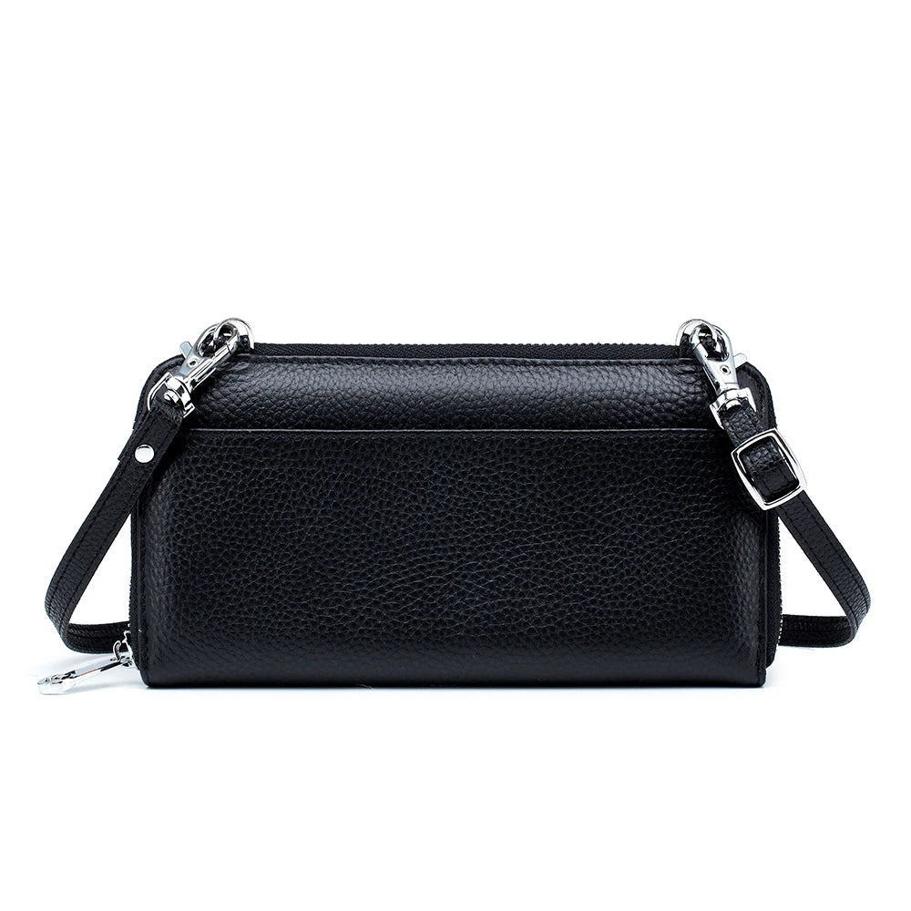 Stay stylish and organized with this women's cow leather horizontal cell phone crossbody bag featuring a transparent touch screen and long zipper wallets.