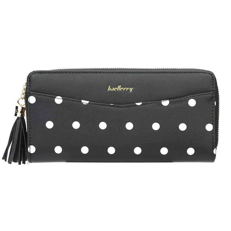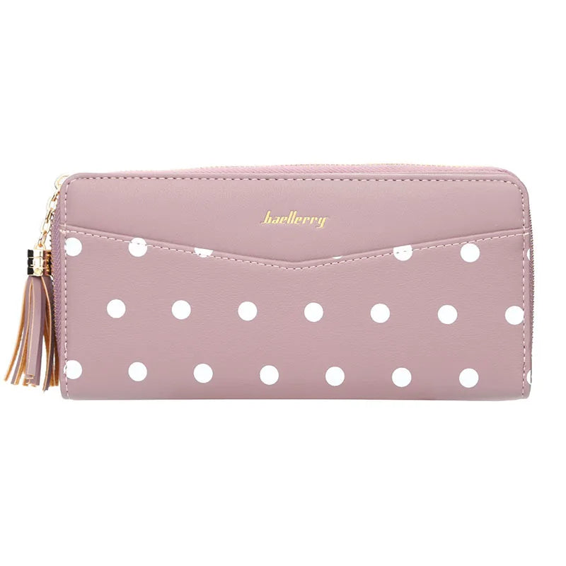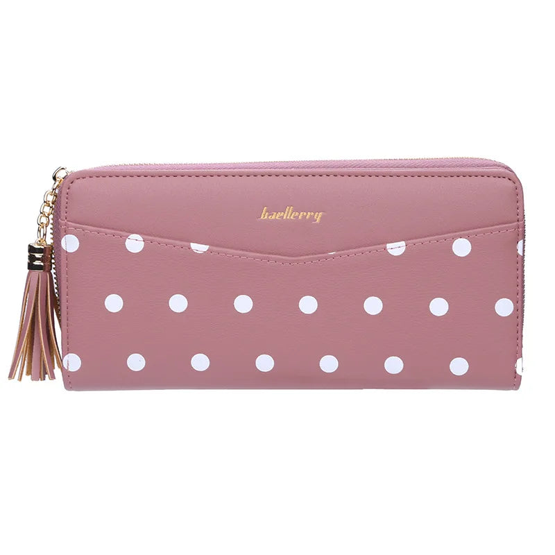 This women's wallet features a stylish dot pattern and tassel design. It is a functional zipper mobile phone bag that can be used as a purse or clutch.