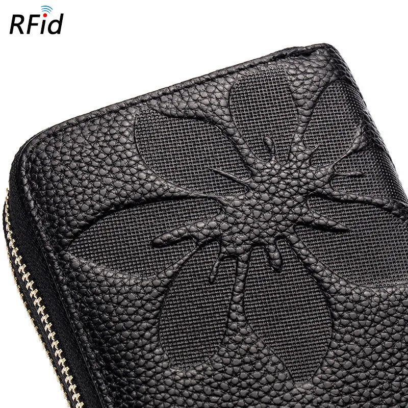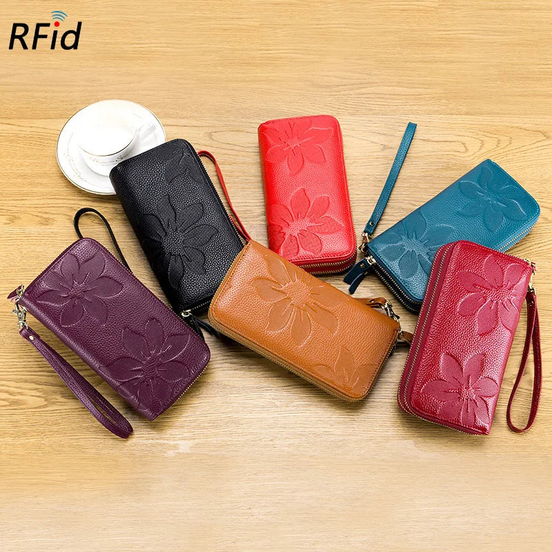 Stay organized and stylish with this women's leather wallet featuring double zipper compartments. It has a wrist band for easy carrying and a debossed flower design.