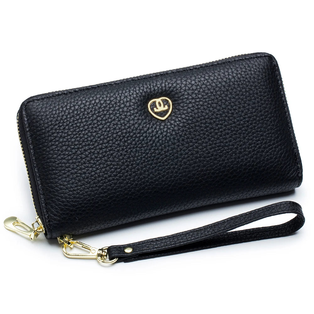 This stylish wallet is made of cow leather and features a wrist strap. It is perfect for casual use and has an interior zipper compartment.