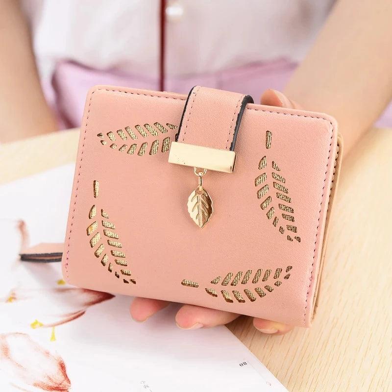 This short zipper wallet is perfect for women on-the-go. It features a beautiful hollow out leaves design and is made of high-quality leather. Keep your essentials organized in style with this small clutch bag.
