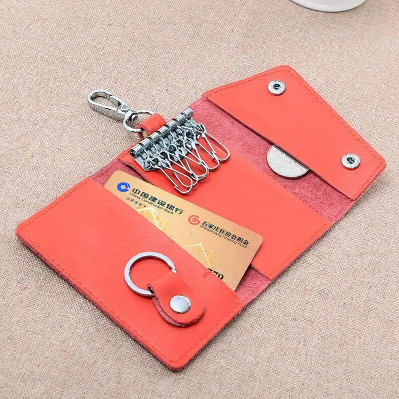 Keep your keys organized in style with this durable cow leather key wallet. Features a zipper closure and multiple compartments for keys and cards.