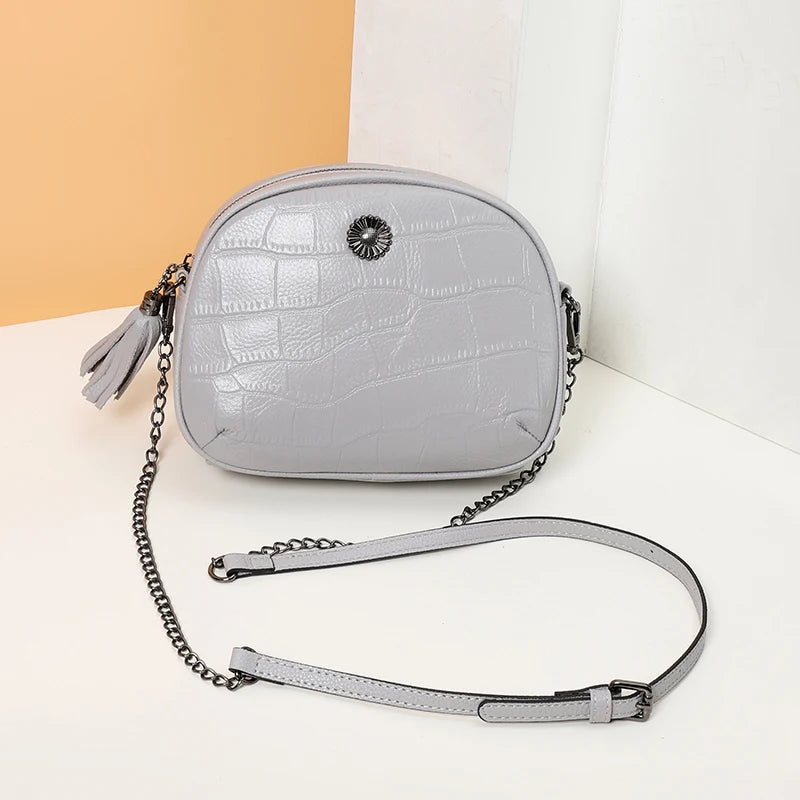 This stylish gray bag is perfect for women on-the-go. Made of high-quality leather, it features a chain strap, tassel detail, and can be worn as a shoulder or crossbody bag. Ideal for carrying your phone and essentials.