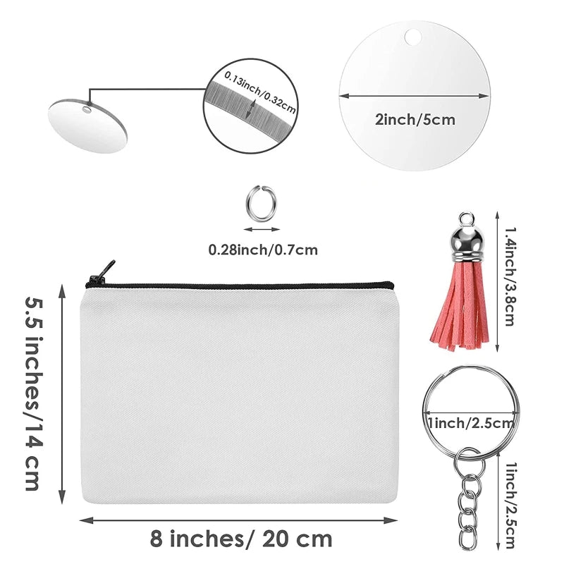 Personalize these heat transfer blank cosmetic bags and zipper makeup storage bags with this set of 10. The round acrylic keychain blanks are perfect for customizing. A great choice for crafters!