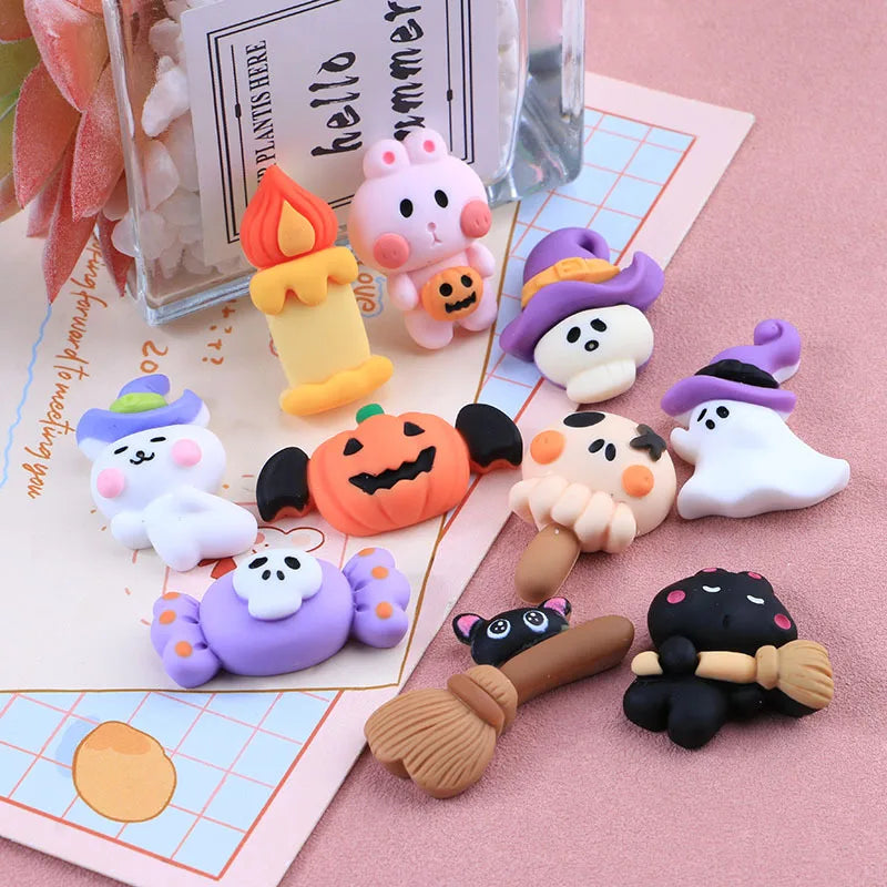 Get into the Halloween spirit with this set of 10 resin flatback patches featuring pumpkins, ghosts, candles, and skulls. Perfect for crafting phone cases, hairpins, earrings, and charms.